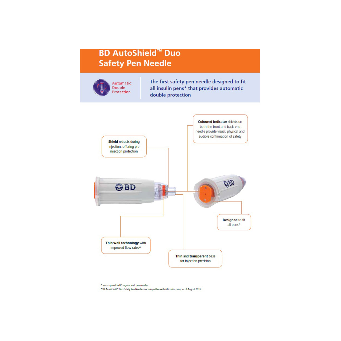 The patented BD AutoShield Duoƒ?› pen needle offers protection on both patient AND pen/cartridge ends.