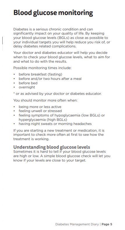 Record target blood glucose levels, readings before and after meals, before bed and overnight. You can even record insulin units, for those currently taking insulin. This management diary makes diabetes self-management easy.