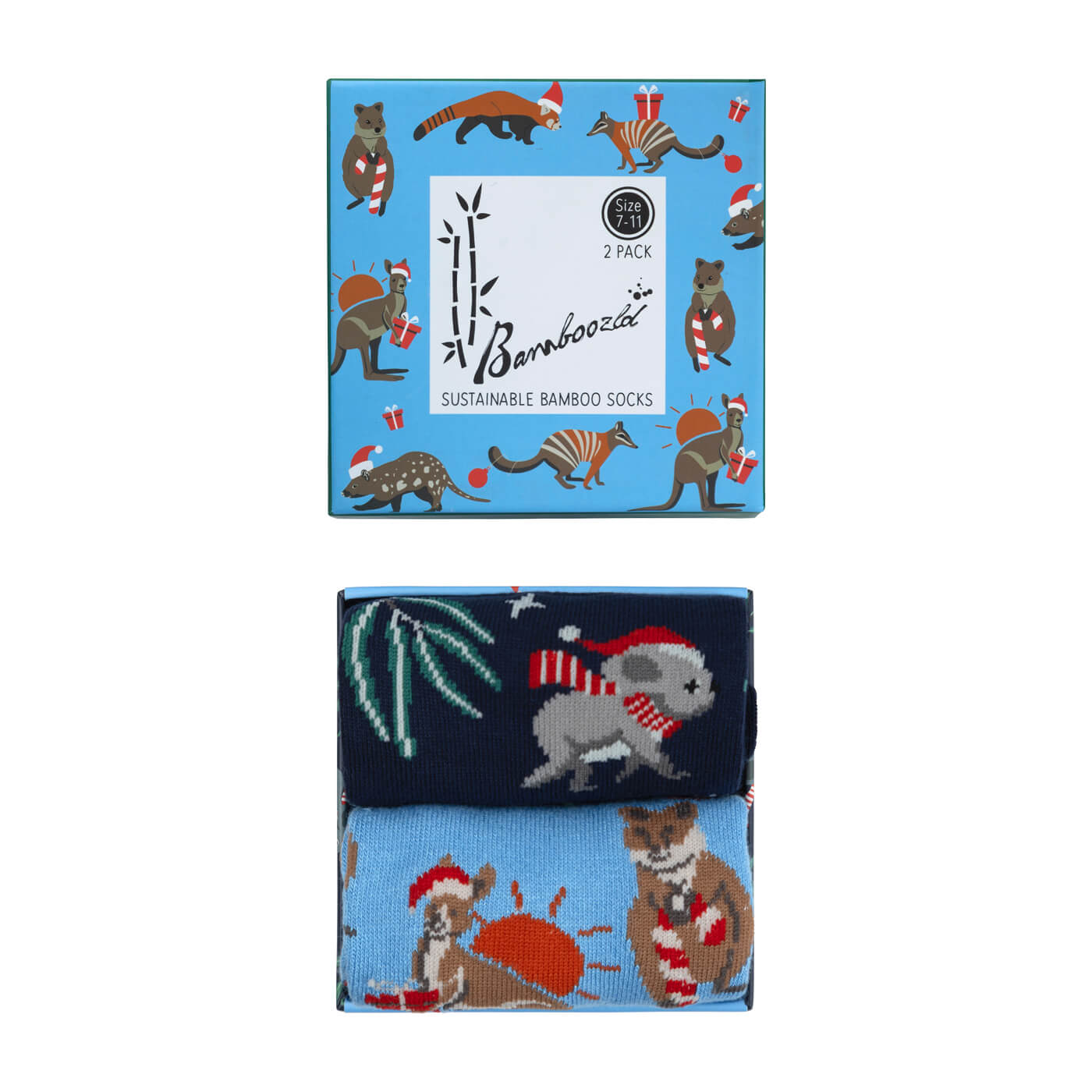 This 2pk?˜Gift Box?˜is the perfect Christmas gift for someone special or a delightful treat for yourself. This festive gift box includes two pairs of crew socks featuring playful designs with Marsupial Xmas animals and a charming Gumleaf Koala, all elegantly packaged in a matching gift box.